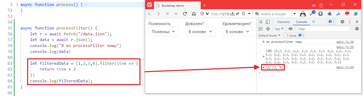 Чтобы не ломать код, которые был сделан в прошлом задании, я создам новую функцию в main.js и назову ее processFilter, запихаю в нее стягивание списка данных, вот так: